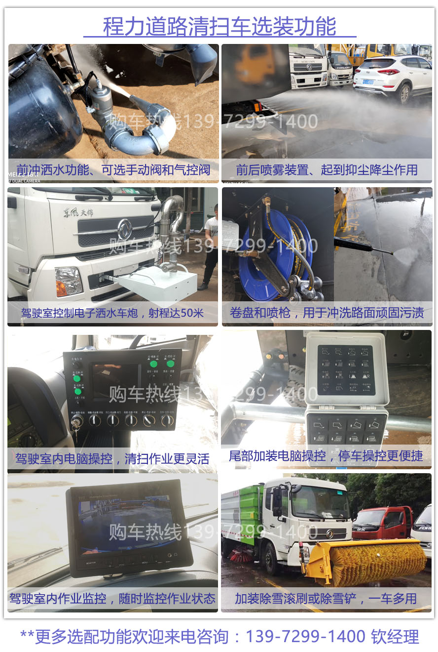 二、上裝配置: 1、帶2個中置掃盤;中置超寬吸嘴;雙層吸塵筒;康明斯170馬力副發動機,3800軸距多利卡配江鈴64kW增壓副發動機;臺灣液壓閥;大力馬達;德國高壓水泵(前沖/側噴/中噴/后噴霧)/側沖洗水槍/垃圾箱自潔裝置);萬向高壓路沿清洗;威龍低壓泵(前沖),氣動球閥控制;4mm不銹鋼垃圾箱;不銹鋼水箱;德國控制器;尾部箭頭燈;機油、垃圾箱、水箱均帶防溢或低位報警裝置;倒車及洗掃狀態室內監視器;多種語音提示;倒車自動保護、防傾倒垃圾翻車保護、檢修安全保護;20m高壓沖洗卷盤;刷臂轉動機構使用德國進口高新耐磨工程隔套