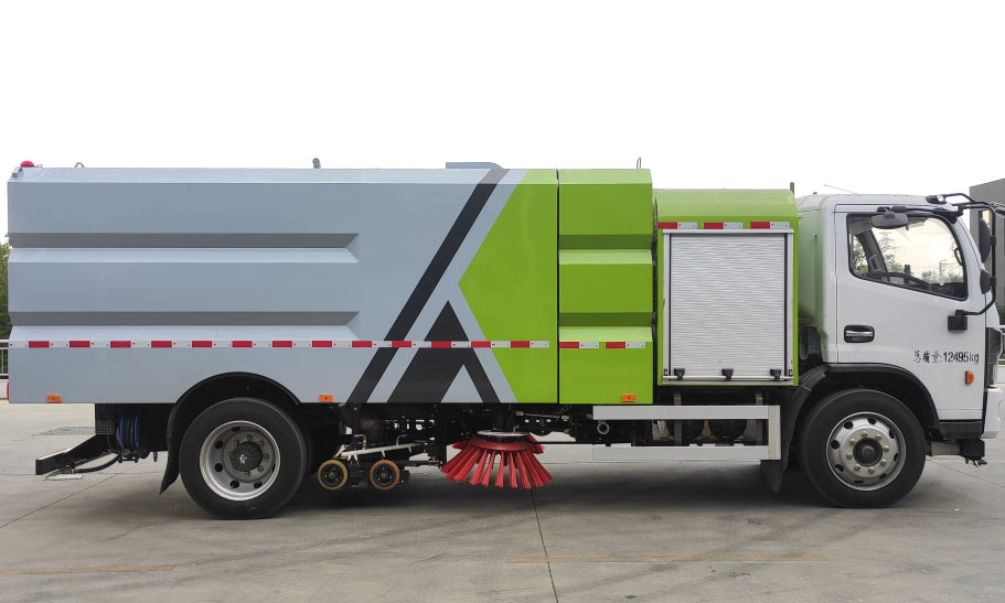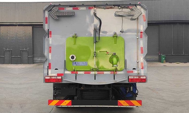 3、洗掃車采用東風純電動二類汽車底盤改裝,加裝風機、高壓水泵、清水箱、垃圾箱、左右立掃、帶噴水桿的寬吸嘴、掃盤降塵系統、液壓系統、專用裝置電控系統和副車架等改裝而成。