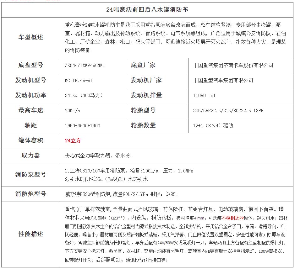 一、底盤配置: 采用重汽豪沃HOWOZZ5447TXFV466MF5車身,配置玉柴MC11.46-61發(fā)動機460馬力,國六排放標準,軸距1950+4600+1400(mm),整備質(zhì)量17.2噸,額定載質(zhì)量24.8噸,陜齒十二擋變速箱,帶動力轉(zhuǎn)向,帶原廠空調(diào),該車上黃牌,城區(qū)道路請注意限行標識。